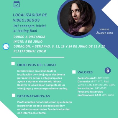 Modalidad: A distancia Nivel: Traductores profesionales que deseen incursionar en esta especialización y estudiantes avanzados de traducción a los que les interese el tema. Inicio: 5.6.21 Duración: Cuatro semanas Lugar: Plataforma Zoom Programa: ver Descargar -