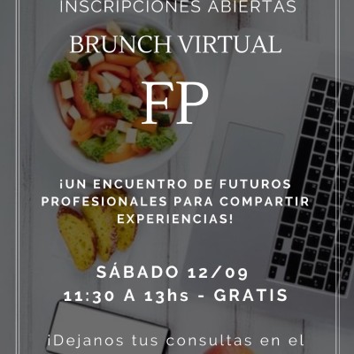 Detrás de un fondo gris traslúcido, una mesa servida, una computadora portátil y un celular. En letras blancas: Inscripciones abiertas para el brunch virtual gratis de FP. ¡Un encuentro de futuros profesionales para compartir experiencias! Sábado 12 de septiembre de 11:30 a 13:00. ¡Dejanos tus consultas en el formulario de inscripción!