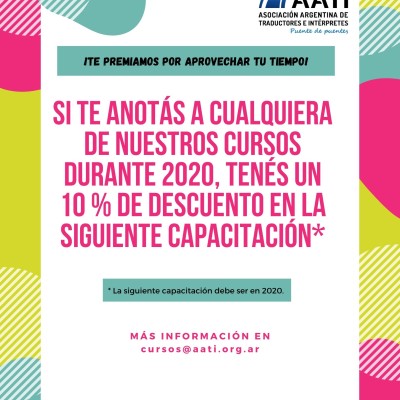 Este año, ¡todas las personas que hagan Cursos de la AATI tienen beneficios! Si te inscribís a uno de nuestros cursos, tenés un 10 % de descuento en el próximo. También recordá que si estás en el exterior ya podés pagar con TransferWise.